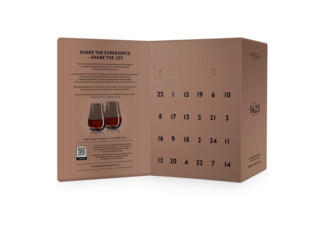 Rumový kalendář je dárková kazeta s perforovanými okénky uvnitř. Najdete zde degustační skleničky a za každým okénkem označeným číslem 1–24 malý vzorek (20ml) třtinového rumu pro každý den. Každý den, až do Štědrého dne, máte možnost objevit a ochutnat nový rum.