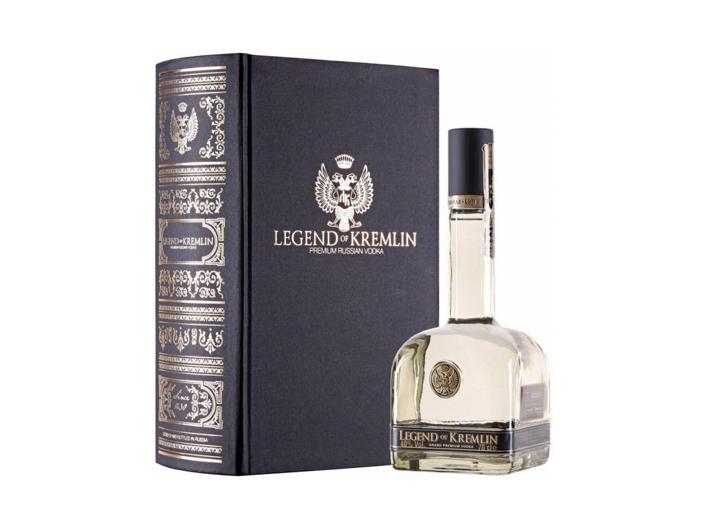 Limitovaná edice vodky Legend of Kremlin ve stylovém knižním boxu je vyrobená ze speciálního obilného destilátu "Lux" (ten obsahuje 96,5% alkoholu) a měkké vody artézské studny.